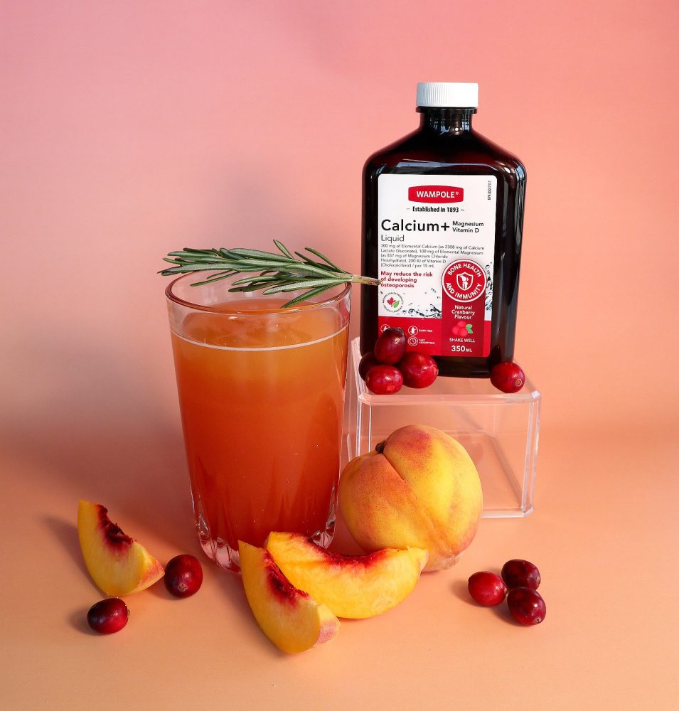 - In another glass, add 15 mL of Wampole Calcium + Magnesium & Vitamin D Liquid to 2 oz of cranberry juice