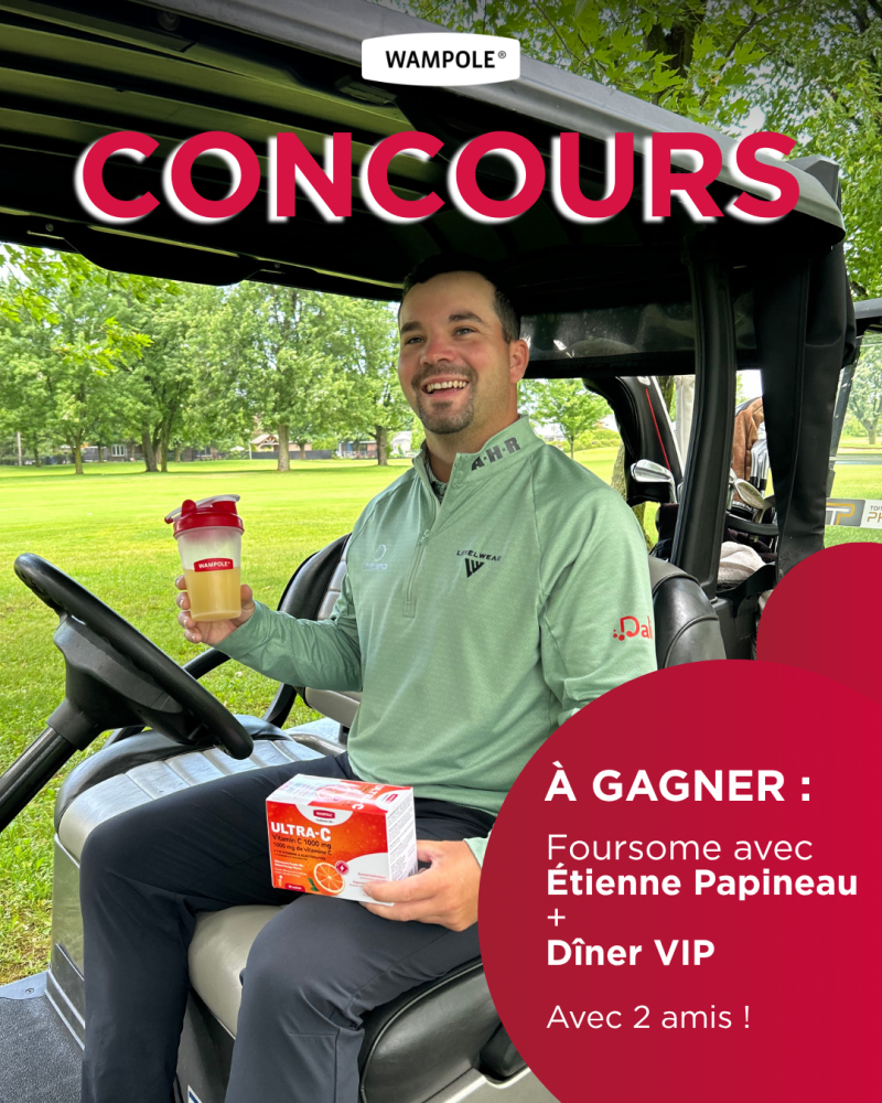 Pour être éligible au concours, les participants devront remplir le formulaire du concours sur wampole.wp.vortexdev.com. Une (1) seule participation par personne via le formulaire du concours, mais aucune limite pour les participations supplémentaires résultantes d’un commentaire sur Facebook ou Instagram. Un(e) (1) gagnant(e) sera déclaré(e) pour le concours. Le prix consiste d’une (1) partie de golf en formule foursome le 4 septembre 2025 pour le gagnant du Concours et deux (2) de ses invités en compagnie de l’athlète de golf Étienne Papineau, au Club de golf Pinegrove situé 200 Av. des Pins, Saint-Jean-sur-Richelieu, QC J2W 2J6, précédée d’un (1) dîner convivial, le tout d’une valeur totale approximative de mille dollars (1 000$ CAD). Les chances de gagner dépendent du nombre de participations valides. En cochant la case « J’accepte les conditions générales du concours », vous participez et acceptez d’être lié par le règlement du concours et de vous y conformer. Ce concours n’est nullement affilié, cautionné, présenté, parrainé ou organisé par un réseau social, incluant Facebook et Instagram.
